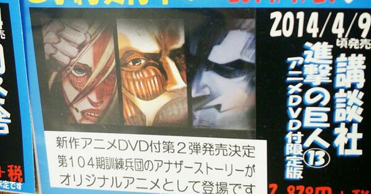 Japanese retailers Seibunkan, Presepe, and e alamode list Hajime Isayama's 13th Attack on Titan manga volume in a limited-edition bundle with a new original animation DVD on April 9, 2014. According to the store listings, the anime will depict another story about the 104th Training Corps.