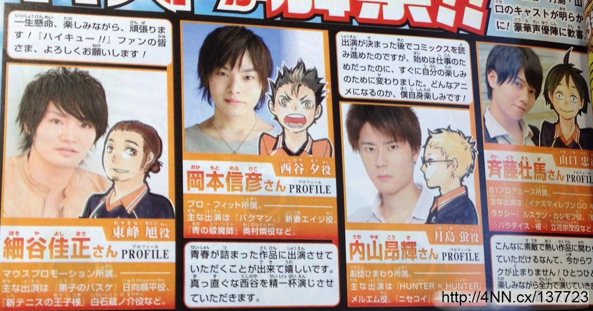 This year's 52nd issue of Shueisha's Weekly Shonen Jump magazine is announcing on Monday four more cast members for the anime of Haruichi Furudate's Haikyu!! volleyball manga.