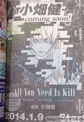 The first 2014 issue of Shueisha's Young Jump magazine is announcing on Thursday that manga artist Takeshi Obata (Hikaru no Go, Death Note) will launch an adaptation of All You Need Is Kill novel by Hiroshi Sakurazaka (Modern Magic Made Simple). Ryōsuke Takeuchi (ST&RS) is drafting the story adaptation, and Obata is basing the character designs on the original novel illustration work by Yoshitoshi ABe (Serial Experiments Lain, Texhnolyze). The mini-series will debut in the magazine's combined 6th/7th 2014 issue, which will ship on January 9.