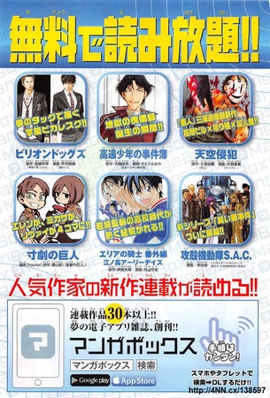 The app will also include the school picaresque story Billion Dogs by Muneyuki Kaneshiro (Kami-sama no Iu Toori/As the Gods Will) and Naoki Serizawa (Saru Lock), the Kindaichi Case Files spinoff series Takatō Shōnen no Jikenbo by Seimaru Amagi and Fumiya Sato, Tenkū Shinbon (about a killer in a skyscraper) by Tsuina Miura (Ajin) and Takahiro Ōbo (Box!), and The Knight in the Area spinoff series Area no Kishi Bangai-hen: Enokō Early Days (about the high school days of Coach Iwaki) by Hiroaki Igano and Kaya Tsukiyama.