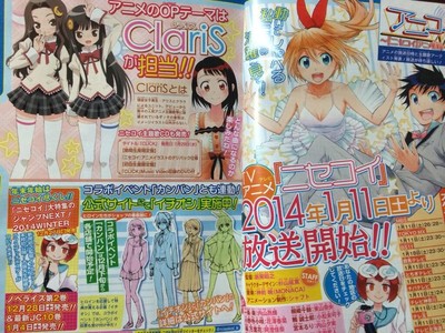 The 2014 second issue of Shueisha's Weekly Shonen Jump magazine is announcing on Monday that the duo Claris will perform the opening theme song "CLICK" for the television anime adaptation of Naoshi Komi's Nisekoi romantic comedy manga. The magazine is also revealing that the series will premiere on January 11 on MBS, Tokyo MX, and several other stations.