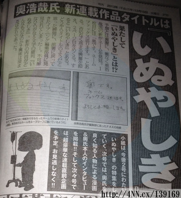 The first 2014 issue of Kodansha's Evening magazine is announcing on Tuesday the first details of the next serialized manga from Hiroya Oku (Gantz, HEN). Oku is drawing the series, titled Inuyashiki (Dog Mansion).