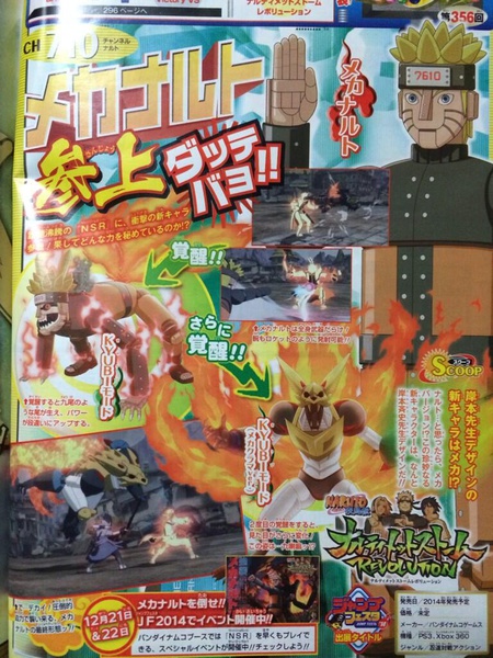 2014's combined 4th/5th issue of Shueisha's Weekly Shonen Jump magazine is revealing on Saturday that the upcoming Naruto Shippūden: Ultimate Ninja Storm Revolution (Narutimate Storm Revolution) PlayStation and Xbox 360 fighting game will include a "Mecha Naruto" playable character.
