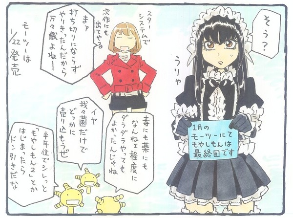 Manga creator Masayuki Ishikawa announced on Monday that he will end his popular series Moyashimon (Moyasimon: Tales of Agriculture) in the March 2014 issue of Morning two magazine on January 22, 2014. Ishikawa drew a "four-panel announcement manga" to report the news via the Gothic Lolita-dressed Kei Yūki and antibacterial freak Hazuki Oikawa: