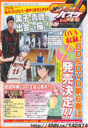 The sixth Blu-ray Disc/DVD volume of the second Kuroko's Basketball anime season will include an original video anime on June 20. This year's eighth issue of Shueisha's Weekly Shueisha Jump magazine is making the announcement on Monday. Episode "41.5 Quarter" ("Mō Ikkai Yarimasen ka") will adapt the 124th chapter from Tadatoshi Fujimaki's original manga, which depicts when Kuroko and Aomine met.