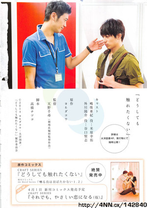 Vol. 59 of Taiyoh Tosho's Craft anthology announced on Monday that a live-action film adaptation of Kou Yoneda's Boys Love manga No Touching At All (Dōshitemo Furetakunai) has been green-lit. Run and Gun band member Kousuke Yonehara (Ushijima the Loan Shark) will play Toshiaki Shima, while Masashi Taniguchi (Higurashi no Naku Koro ni) will play Yōsuke Togawa. This will be director Chihiro Amano's first feature film, and Natsuko Takahashi (Antique Bakery, Uragiri wa Boku no Namae o Shitteiru) wrote the screenplay. Taiyoh Tosho will announce more details through its homepage and publications.