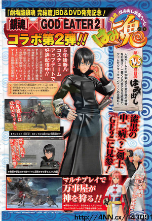 This year's ninth issue of Shueisha's Weekly Shonen Jump magazine is confirming a second collaboration between the Gintama manga/anime franchise and Namco Bandai Games' God Eater 2 game for PS Vita and PSP on Monday. To celebrate the Blu-ray Disc and DVD release of Gekijōban Gintama Kanketsu-hen: Yorozuya yo Eien Nare (Final Gintama: The Movie: Be Forever Yorozuya), the game is offering a costume of Gintama's Shinpachi, five years into the future.