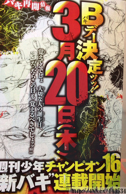 This year's ninth issue of Akita Shoten's Weekly Shōnen Champion magazine is announcing on Thursday that a new series of Keisuke Itagaki's Baki manga will begin in the 16th issue, which is scheduled for March 20. The magazine says that March 20 is also the birthday of a very important person. Itagaki announced plans to resume the series last month.