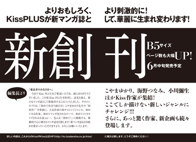 Kodansha will launch a new magazine in mid-June focusing on "the fun of meeting for the first time" to replace Kiss Plus, as well as a new shonen magazine to replace Gekkan Shonen Magazine Plus this summer or fall. No further details on the new shonen magazine have been revealed, but Kodansha's Gekkan Shonen Magazine will publish follow-up information.