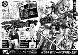 The May issue of Comic Zenon, which will ship on March 24, will include the first chapter of Gifū Dōdō!! Naoe Kanetsugu -Maeda Keiji Hana-gatari, the final series in Tetsuo Hara and Nobuhiko Horie's story about samurai Maeda Keiji. Masato Deguchi will draw the series.