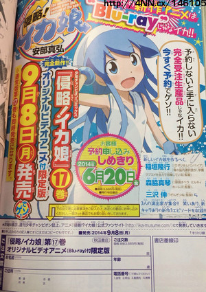 This year's 13th issue of Akita Shoten's Shōnen Champion magazine is announcing on Thursday that Masahiro Anbe's 17th Squid Girl (Shinryaku! Ika Musume) manga volume will bundle an original video anime. Unlike the two previous original video anime releases, this September 9 limited edition will bundle a Blu-ray Disc instead of a DVD.