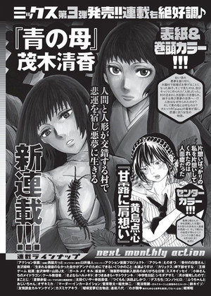 The preview for the May issue of Futabasha's Monthly Action magazine announced on Tuesday that Pupa manga creator Sayaka Mogi will begin serializing the new manga titled Ao no Haha (Mother of Blue) in the issue, which is scheduled to ship in Japan on March 24.