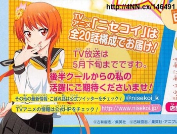 This year's 14th issue of Shueisha's Weekly Shonen Jump magazine is announcing on Monday that the Nisekoi anime will be 20 episodes long and will wrap up in late May.