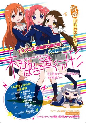 Mikakunin de Shinkōkei (literally, "Unconfirmed & In-Progress") is a four-panel comedy manga serialized in Ichijinsha's Manga 4-Koma Palette about Kobeni Yonomori, who on her 16th birthday suddenly has a young man with little presence named Hakuya Mitsumine and his little sister Mashiro appear in front of her. It turns out that Hakuya is her fiancé, and Mashiro is her future sister-in-law. The three (and Konbeni's big sister Benio) start living together underneath the same roof, and hilarious happenings occur. The anime adaptation has been licensed by Sentai Filmworks and is streaming on Crunchyroll.