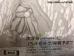 This year's sixth issue of Hakusensha's Young Animal magazine will announce on Friday that Kentarō Miura will resume the Berserk manga in the eighth issue on April 11.