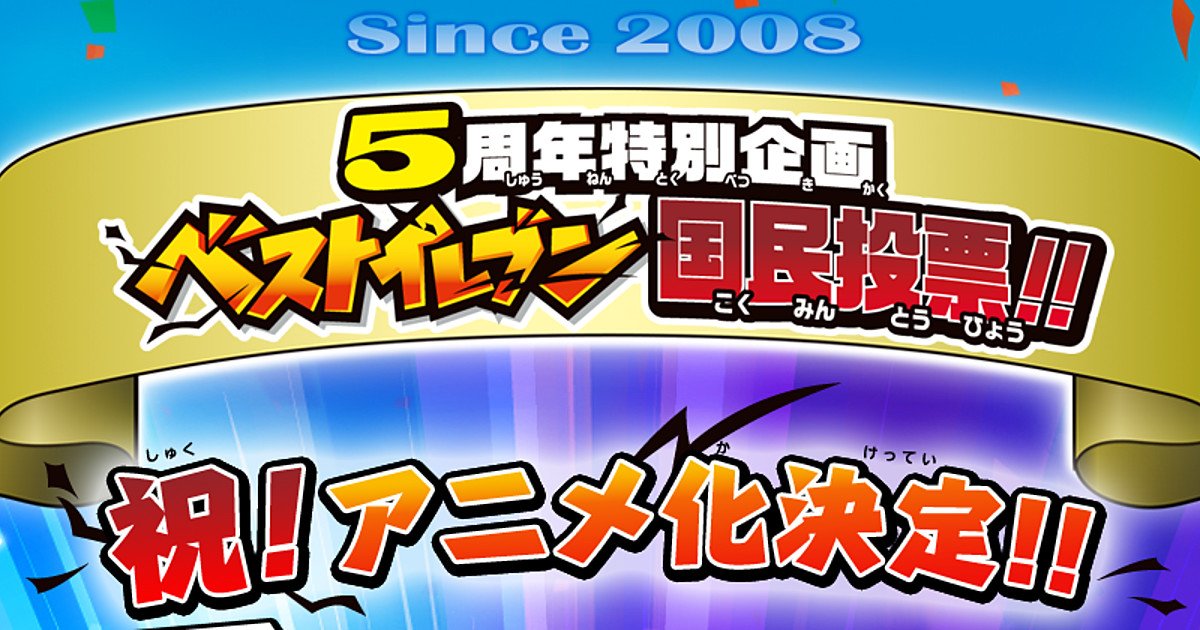 The official Inazuma World blog announced that the characters chosen in the "Best Eleven!" fan poll will feature in a film slated to open in Japan this summer. Fans voted to choose the members of the Inazuma Best Eleven team that will face off against the special Battle Eleven team in the new anime. There will be an Inazuma Best Eleven trading card game, manga, character song album, and more to tie in with the anime.