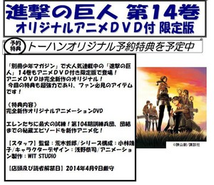 Japanese retailer Presepe is listing Hajime Isayama's 14th Attack on Titan manga volume in a limited-edition bundle with a new original animation DVD on August 8. Presepe's listing notes that the completely new anime will detail Eren and his friends' greatest trial yet. The anime will depict a "memorable episode before the 104th Training Corps became unified."