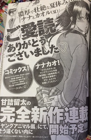 The May issue of Hakusensha's Young Animal Arashi magazine announced earlier this month that Ryuta Amazume will start a brand-new series in the same magazine "not too long from now." Amazume just ended his Nana to Kaoru Black Label manga in the same magazine issue, and the fifth and final compiled book volume will ship on July 29. Like previous volumes, the limited first edition of the final volume will bundle a "dōjinshi."