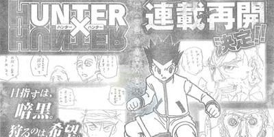 This year's combined 22nd/23rd issue of Shueisha's Weekly Shonen Jump magazine is announcing on Monday that Yoshihiro Togashi will resume his Hunter X Hunter manga in the 27th issue on June 2. The tagline for the manga's return reads, "What is being aimed for is darkness. What is being hunted is hope. What blocks the way is endless despair."