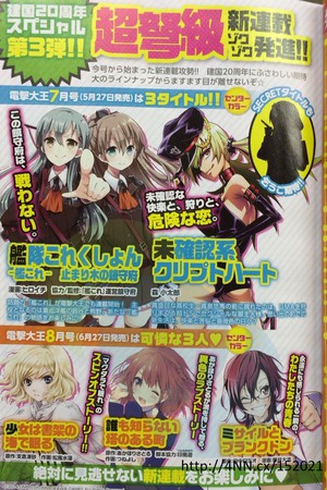 The series will begin in the magazine's July issue on May 27 along with two other titles: Mikakunin-kei Crypto Heart (Unknown Group Crypto Heart) by Kotarō Mori (Gurren Lagann manga), and a "secret title." Mori's new series follows a serious high school student named Yūma Mashima who meets a sexy hunter of UMAs (unidentified mysterious animals) and begins a new life in his old town.