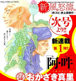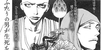 The June issue of Shogakukan's Monthly Big Comic Spirits magazine is announcing on Saturday that Mari Okazaki's new A-Un manga will debut in the following issue on May 27. This new historical series is set in the Heian period and will be follow the story of two prominent Buddhist monks, Saichō, the man who built of Enryaku Temple, and Kūkai, the man who established the Mt. Kōya retreat. The first chapter will have 60 pages with a color opening page and will also be featured on the cover of the magazine.