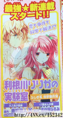 The manga titled Tonegawa Ririka no Lab Story (Ririka Tonegawa's Lab Story; “lab story” is a pun on the words “love story”) will have a story written by novelist Aito Aoyagi, whose Hamamura Nagisa no Keisan Note (Nagisa Hamamura's Calculation Notes) novels have sold over 500 thousand copies. The story will revive around Ririka, a girl who hates science, and a boy who appears in front of her and states that the world is spinning thanks to science. The two end up solving mysteries together using science.