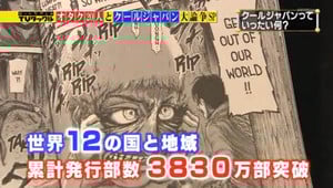 An episode of the TV Asahi program TV Tackle reported on Monday that Hajime Isayama's Attack on Titan manga series has more than 38.3 million copies in print in 12 countries and territories. The "Anime Manga Dake Janai!? Nihon Keizai no Kibakuzai 'Cool Japan' tte Nani?" (It's Not Just Anime and Manga!? What Is This 'Cool Japan' That Could Jumpstart the Japanese Economy?) episode was about the Japanese government's "Cool Japan" initiative and the popularity of Japanese popular culture in other countries.