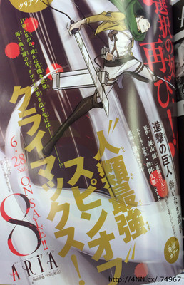 Snark and Suruga launched the spinoff of Hajime Isayama's Attack on Titan manga in Aria last September. The manga focuses on Captain Levi's past, including his first encounter with Commander Erwin and how he entered the Survey Corps.