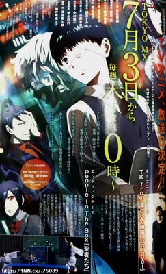 This year's 27th issue of Shueisha's Young Jump magazine is announcing the opening and ending theme song artists for the Tokyo Ghoul television anime on Thursday. TK from Ling Tosite Sigure will perform the opening theme "Unravel," and the band People in the Box will perform the ending theme "Seijatachi" (Saints).