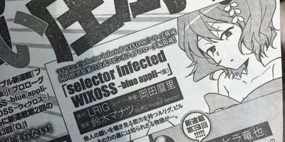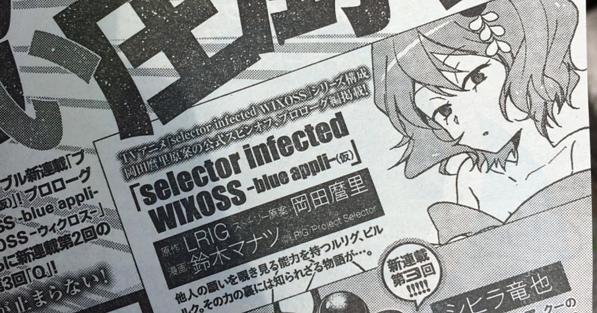 The July issue of Shueisha's Ultra Jump magazine announced on Thursday that the Selector Infected Wixoss anime series will get a spinoff manga in the next issue on July 19. Manatsu Suzuki (World Conquest Zvezda Plot, Abe-kun no Nanakakan Sensen) will draw the tentatively titled Selector Infected Wixoss -Blue Appli- manga, and series' scriptwriter Mari Okada will write the story. The prologue will follow the untold story of the LRIG card Piriluk.