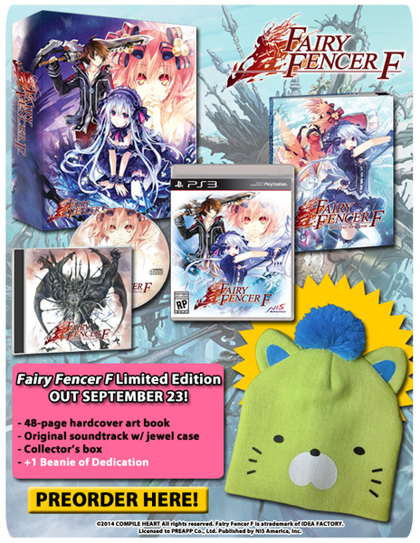 NIS America announced on Friday that it will release Compile Heart's turn-based role-playing game Fairy Fencer F in North America on September 23 and in Europe on September 26. The PlayStation 3 game will be available in both digital and physical formats. The limited edition will bundle a 48-page art book, soundtrack CD, and beanie hat.