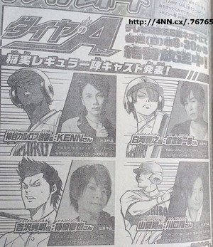 This year's 34th issue of Kodansha's Weekly Shōnen Magazine is announcing the voice cast for the Inajitsu team in the baseball anime Ace of Diamond on Wednesday. KENN, Sōichirō Hoshi, Tetsuya Kakihara, and Shō Yamaguchi (from top left to bottom right) will play Carlos Toshiki Kamiya, Katsuyuki Shirakawa, Hideaki Yoshizawa, and Riku Yamaoka, respectively. Masanori Ishikawa, a real-life pitcher with the Tokyo Yakult Swallows, will also play a character in the 47th episode on September 7.