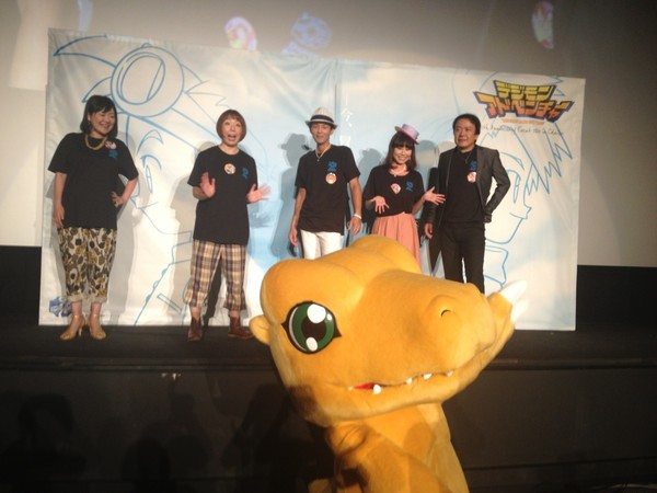 The cast of the first Digimon Adventure anime appeared at the event, and Kōji Wada performed the opening theme song "Butter-fly" live. The picture below features (from left to right) guests Chika Sakamoto (Agumon), Mayumi Yamaguchi (Gabumon), Kōji Wada, Ai Maeda (Mimi) and Ayumi Miyazaki.