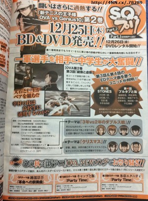 The second OVA volume will also include at least three new Hōkago no Ōji-sama (The Prince of After School) anime shorts ("Flag ga Tachimakutta," "Wakari Yasuku," and "Shinshutsu Kibotsu") and two versions of the clean opening and ending anime sequences. The bonus extras will include a snapshot of the third-year-vs.-the second-year doubles match at the U-17 Japanese representative training camp, The Prince of After School illustration sheet with a Christmas theme, and eight pages of liner notes. The CDs for the theme songs of the first volume will go on sale on October 4 ("Kakumei e no Prelude" opening), November 12 ("Party Time" episode 1 ending) and November 26 ("Party Time" episode 2 ending).