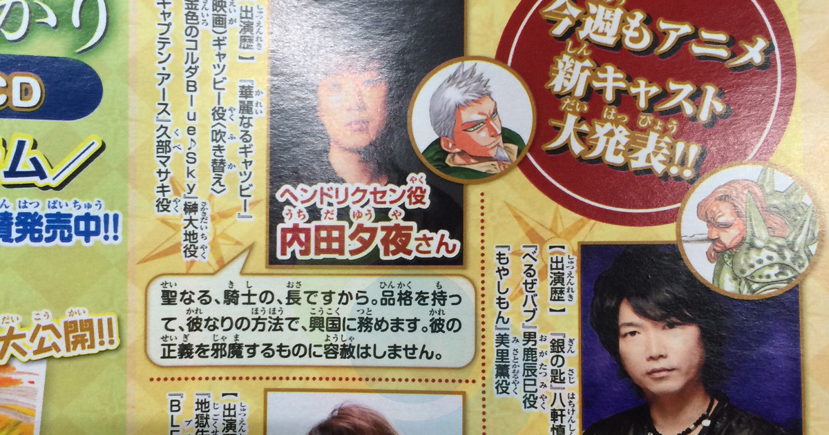 This year's 46th issue of Kodansha's Weekly Shōnen Magazine is announcing three more cast members for the television anime of Nakaba Suzuki's The Seven Deadly Sins (Nanatsu no Taizai) manga on Wednesday. Yūya Uchida will play Hendricksen, Katsuyuki Konishi will play Dreyfus, and Ryōtarō Okiayu will play Helbram.