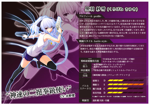 The adventure game being developed by both 5pb. and La'cryma (True Tears PC game, Sora o Tobu, Mittsu no Hōhō) will tell the story of “an intense battle between miracle-users and magic-users.” Suguru Kamiya is writing the scenario for the game. The game stars: