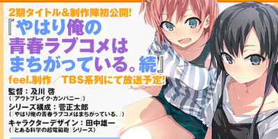 Kei Oikawa (Outbreak Company, Minami-ke: Okaeri) will replace Ai Yoshimura as director in the second season, titled Yahari Ore no Seishun Love Come wa Machigatteiru. Zoku (My Youth Romantic Comedy Is Wrong, As I Expected Sequel), and Yūichi Tanaka (A Certain Scientific Railgun, Natsu-iro Kiseki) will replace Yuu Shindou as the anime character designer. The animation production will move from Brains Base to studio feel., but Shôtarô Suga is returning to series composition. monaca will again be in charge of music and Satoshi Motoyama will again serve as sound director.