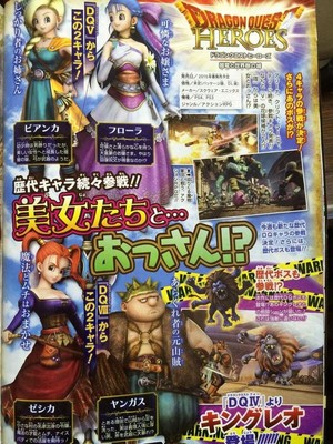 The December issue of Shueisha's V Jump magazine announced on Tuesday that Bianca (Dragon Quest V), Flora (Dragon Quest V; Nera Briscoletti in English versions), Jessica (Dragon Quest VII) and Yangus (Dragon Quest VII) will appear in Square Enix's Dragon Quest Heroes: Yamiryū to Sekai Ki no Shiro game.