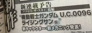 The January 2015 issue of Kadokawa's Monthly Gundam Ace magazine is announcing on Saturday that a new manga series, tentatively titled Mobile Suit Gundam U.C. 0096: Rising Sun, will launch in the magazine. The manga will serve as a sequel to Hiyon Katsuragi's Mobile Suit Gundam U.C. 0094: Across the Sky manga, which ended last month. New characters and new mecha will appear in the sequel manga.