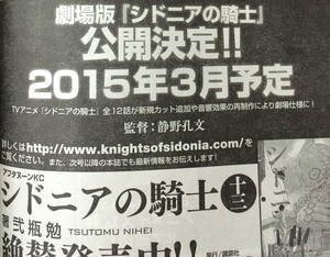 The January issue of Kodansha's Monthly Afternoon magazine is announcing on Tuesday that a theatrical film edition of the first Knights of Sidonia television anime season will open next March. The film will be a compilation of all 12 episodes of the season with new sequences and redone sound effects. Kobun Shizuno, the director of the first season, is also directing the movie.