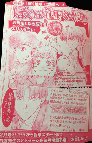 Saki Hiwatari is ending her Please Save My Earth manga sequel Boku o Tsutsumu Tsuki no Hikari (Embraced by the Moonlight) in the January 2015 issue of Hakusensha's Bessatsu Hana to Yume magazine on Wednesday. However, she announced in the same issue that she will launch a new series called Boku wa Chikyū to Utau (I Sing With Earth) in the May issue on March 26. The next manga will continue to tell the stories of Ren and the others.
