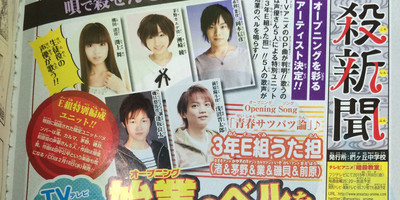 The second 2015 issue of Shueisha's Weekly Shonen Jump magazine is announcing on Monday that five characters in the Assassination Classroom (Ansatsu Kyoshitsu) anime will sing the opening theme song, "Seishun Satsubatsu-ron" (Youth Savage Theory). Nagisa (as voiced by Mai Fuchigami), Kaede (Aya Suzaki), Karma (Nobuhiko Okamoto), Yuma (Ryota Ohsaka), and Hiroto (Shintaro Asanuma) will sing as a group named 3-nen E-gumi Utatan (Class 3-E Song Representatives). Aki Hata wrote the lyrics, and Kouhei Tanaka wrote the music. The theme's CD will ship on February 18.