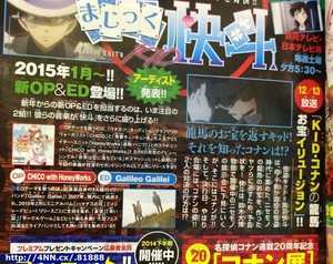 2015's combined 2nd/3rd issue of Shogakukan's Weekly Shonen Sunday magazine is announcing on Wednesday that the Magic Kaito 1412 television anime will introduce new opening and ending theme songs in January. CHICO with Honeyworks will perform the new opening, while Galileo Galilei will perform the new ending.