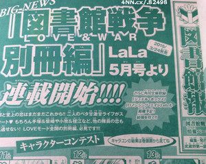 The February 2015 issue of Hakusensha's LaLa magazine is announcing on Wednesday that the Toshokan Sensō: Love & War Bessatsu-hen (Library Wars: Love & War Extra) manga series will launch in the May issue on March 24. Kiiro Yumi just ended the main Library Wars: Love & War manga in the same February 2015 issue.