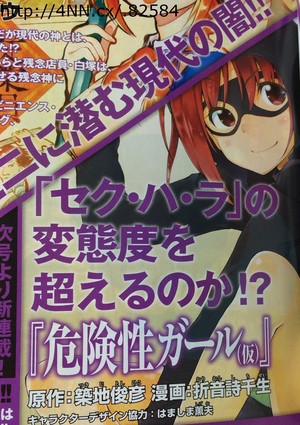 2015's February issue of Kodansha's Monthly Shōnen Sirius will announce on Friday that Toshihiko Tsukiji will write the story for a new manga series tentatively titled Kikensei Girl (Danger Girl) starting in the next issue on January 26. Shichisei Orion to draw series and Shigeo Hamashima will collaborate on character design.