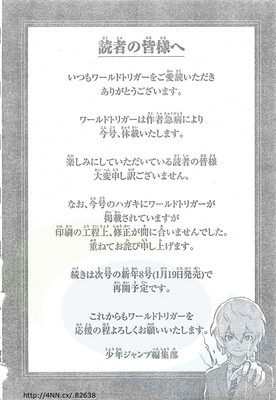 The combined sixth and seventh 2015 issue of Shueisha's Weekly Shonen Jump magazine is announcing on January 5 that due to author Daisuke Ashihara's sudden illness, the World Trigger manga will go on hiatus.