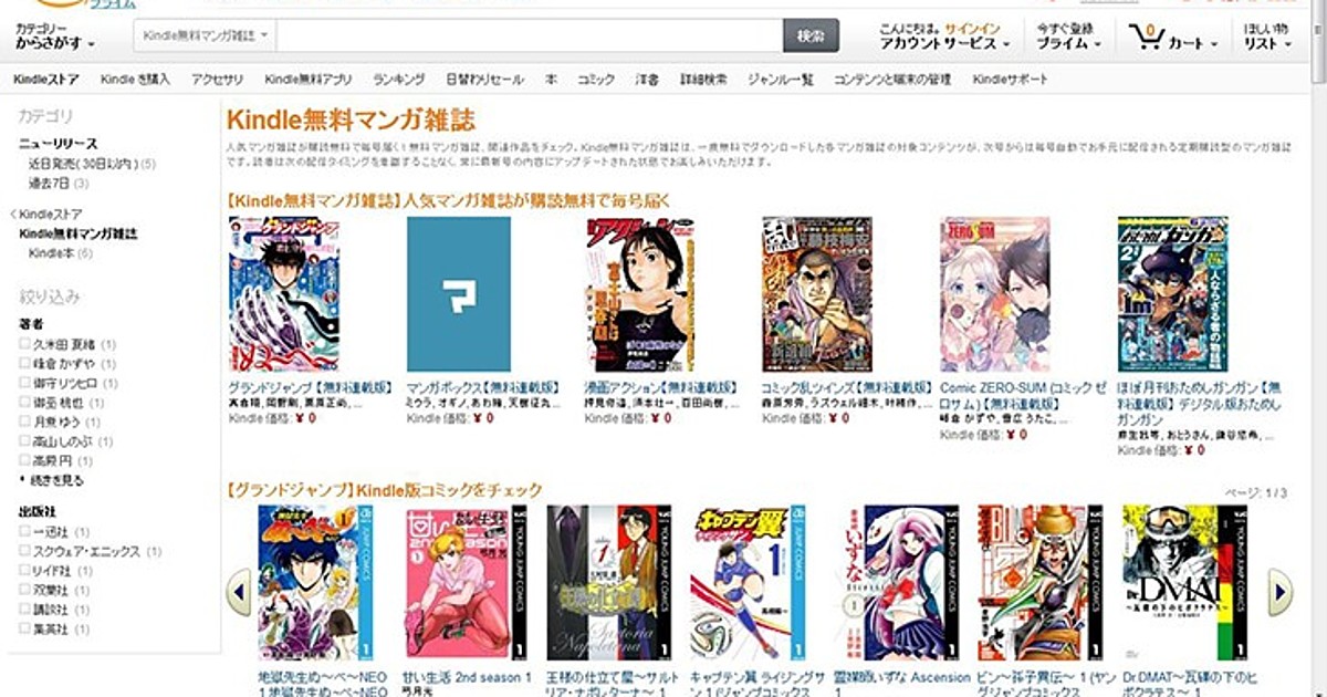 The Japanese arm of the online retailer Amazon launched a new service for reading digital editions of manga magazines for free on Wednesday. The initial Kindle Muryō Manga Zasshi (Kindle Free Manga Magazine) lineup includes the first digital edition of Shueisha's Grand Jump magazine, as well as Futabasha's Manga Action, Leed's Comic Ran Twins, Ichijinsha's Monthly Comic Zero-Sum, DeNA's Manga Box service, and Square Enix's Hobo Gekkan Otameshi Gangan (Almost Monthly Trial Gangan).