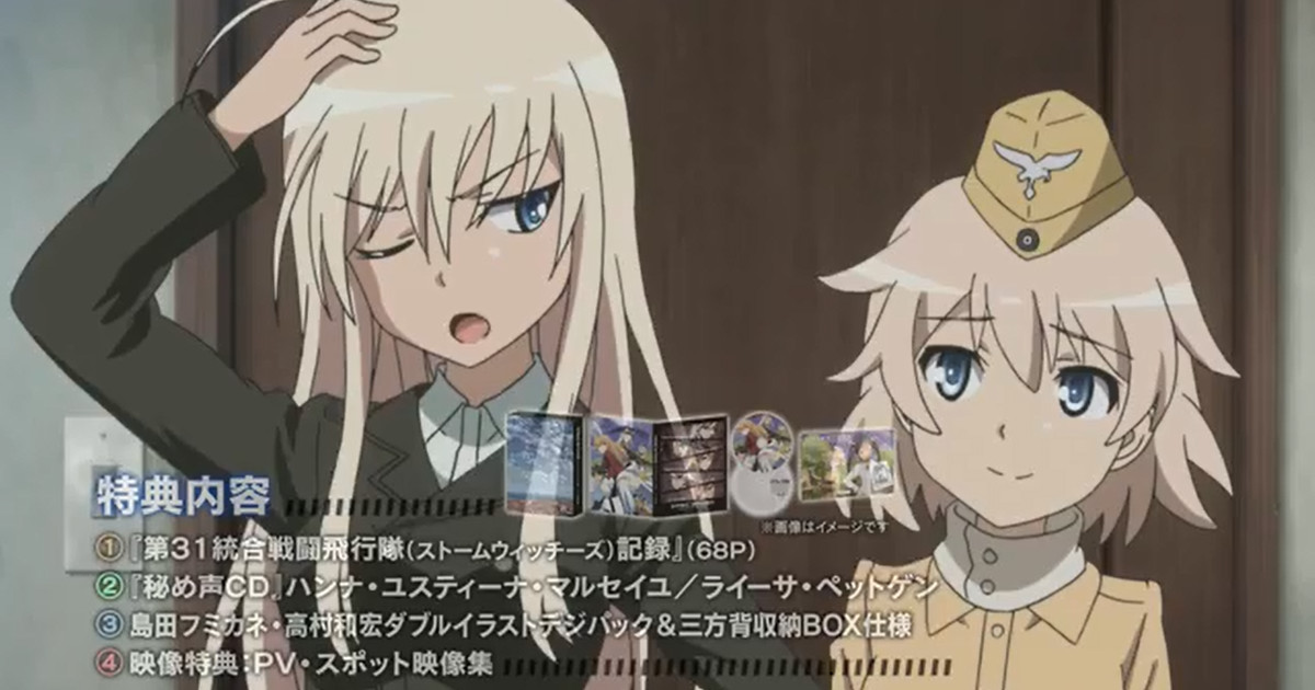 Narrator: The Blu-ray and DVD release of Strike Witches: Operation Victory Arrow Vol. 2 - Aegean Umi no Megami is full of special features, and goes on sale in March!