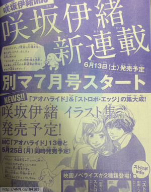 The March issue of Shueisha's shōjo manga magazine Bessatsu Margaret is announcing on Friday that manga creator Io Sakisaka will launch a new series in the July issue on June 13. Shueisha will also publish an illustration collection for Sakisaka on May 25, the same day that her 13th Blue Spring Ride (Ao Haru Ride) manga volume ships in Japan. The illustration collection will feature art from Blue Spring Ride as well as her manga Strobe Edge.