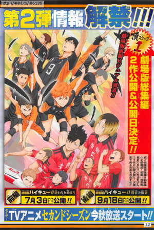 This year's 17th issue of Shueisha's Weekly Shonen Jump magazine is announcing on Monday that the Haikyu!! anime will have two compilations films. It is also reporting that the previously announced sequel will be a second television anime season that begins airing this fall. The first film, Gekijō-ban Haikyu!! Owari to Hajimari (Haikyu!! the Movie: Ending and Beginning), will open on July 3. The second film, Gekijō-ban Haikyu!! Shōsha to Haisha (Haikyu!! the Movie: Winners and Losers), will open on September 18. The magazine unveiled a visual for the films.